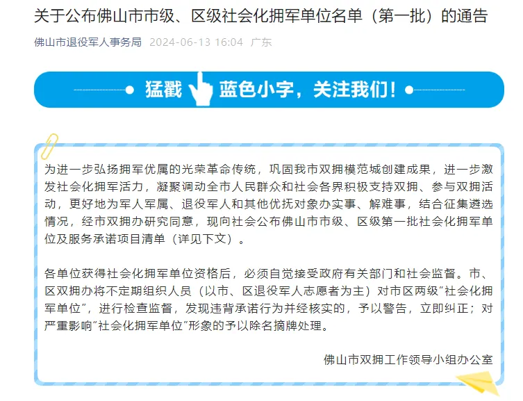 春風(fēng)拂面,喜訊頻傳。根據(jù)佛山市雙擁工作領(lǐng)導(dǎo)小組辦公室于6月13日發(fā)布的關(guān)于公布佛山市市級(jí)、區(qū)級(jí)社會(huì)化擁軍單位名單(第一批)的通告中,我院榮獲“禪城區(qū)社會(huì)化擁軍單位”稱號(hào)。